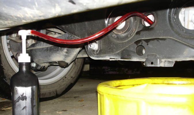 - Si no tiene espacio para inclinar el recipiente del aceite nuevo, ayúdese con una manguera, coloque una parte en la boquilla del aceite y la otra en la entrada del diferencial.