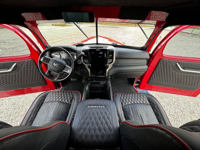 Los asientos de cuero negro con costuras en rojo, el tapizado con detalles de cocodrilo y la pantalla táctil de gran tamaño muestran que estos vehículos no solo son imponentes por fuera, sino también lujosos por dentro. La caja de carga, revestida en madera de roble negro, añade un toque de sofisticación, mientras que la suspensión Carli y los neumáticos de 40 pulgadas aseguran un rendimiento todoterreno sin igual.