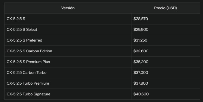 Por su parte, el Mazda CX-5 2025 se vende en Estados Unidos con un rango de precios que va desde $28,570 para la versión base 2.5 S hasta $40,600 para el modelo 2.5 Turbo Signature.